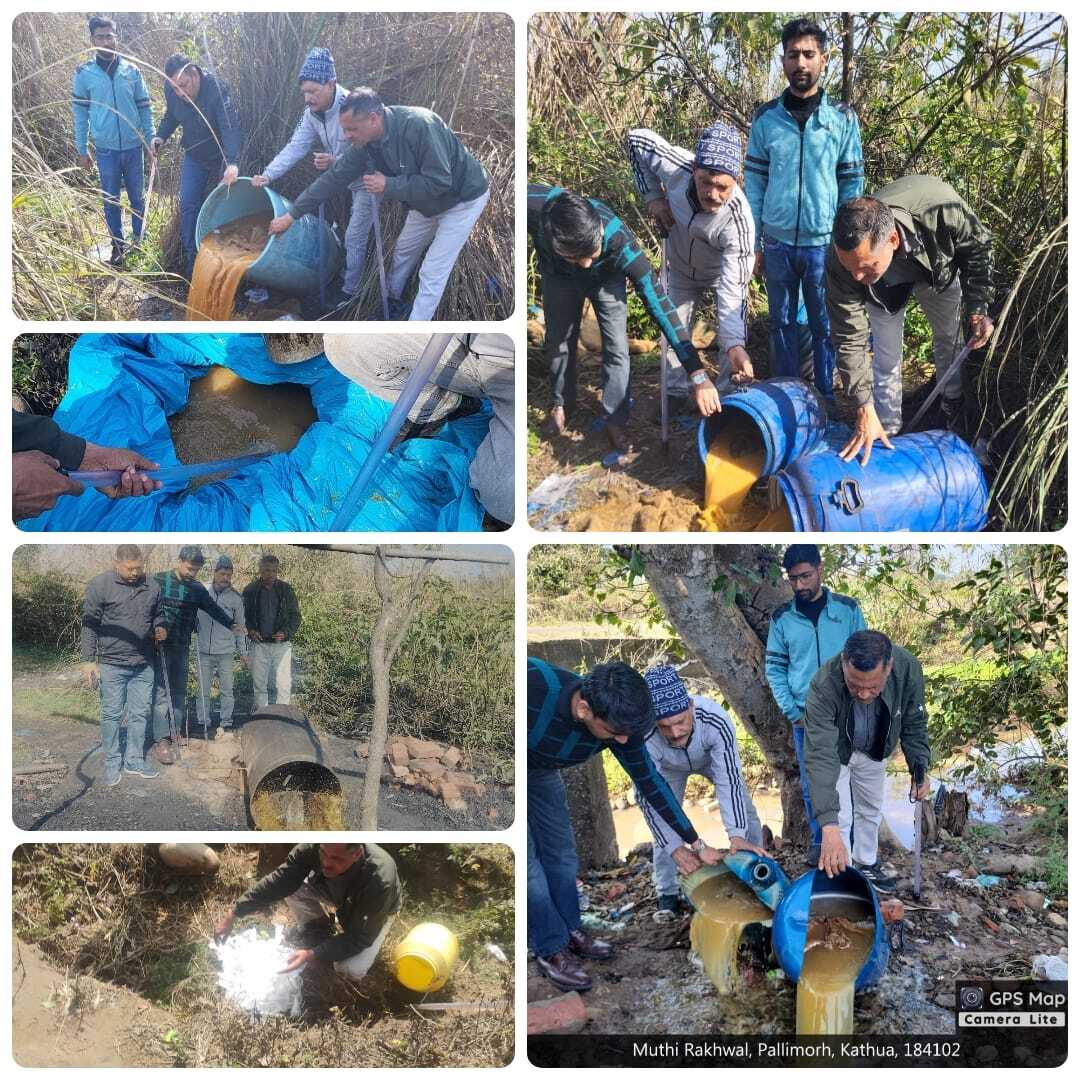 On 28-01-2026, on the direction of Worthy Excise Commissioner and DEC Executive, Jammu and under Close supervision of ETO Kathua, ERK officials consisting Inspectors and other staff raided multiple hotspots i.e Palli, Muthi Rakwala, Chathyal, Nihalpur, Muthi Jagir. During the raid about 3600 Kg Lahan, along with approximately 32 Litres illicit Liquor, found unattended from stateland. aforementioned Lahan/Illicit Liquor were destroyed on spot.