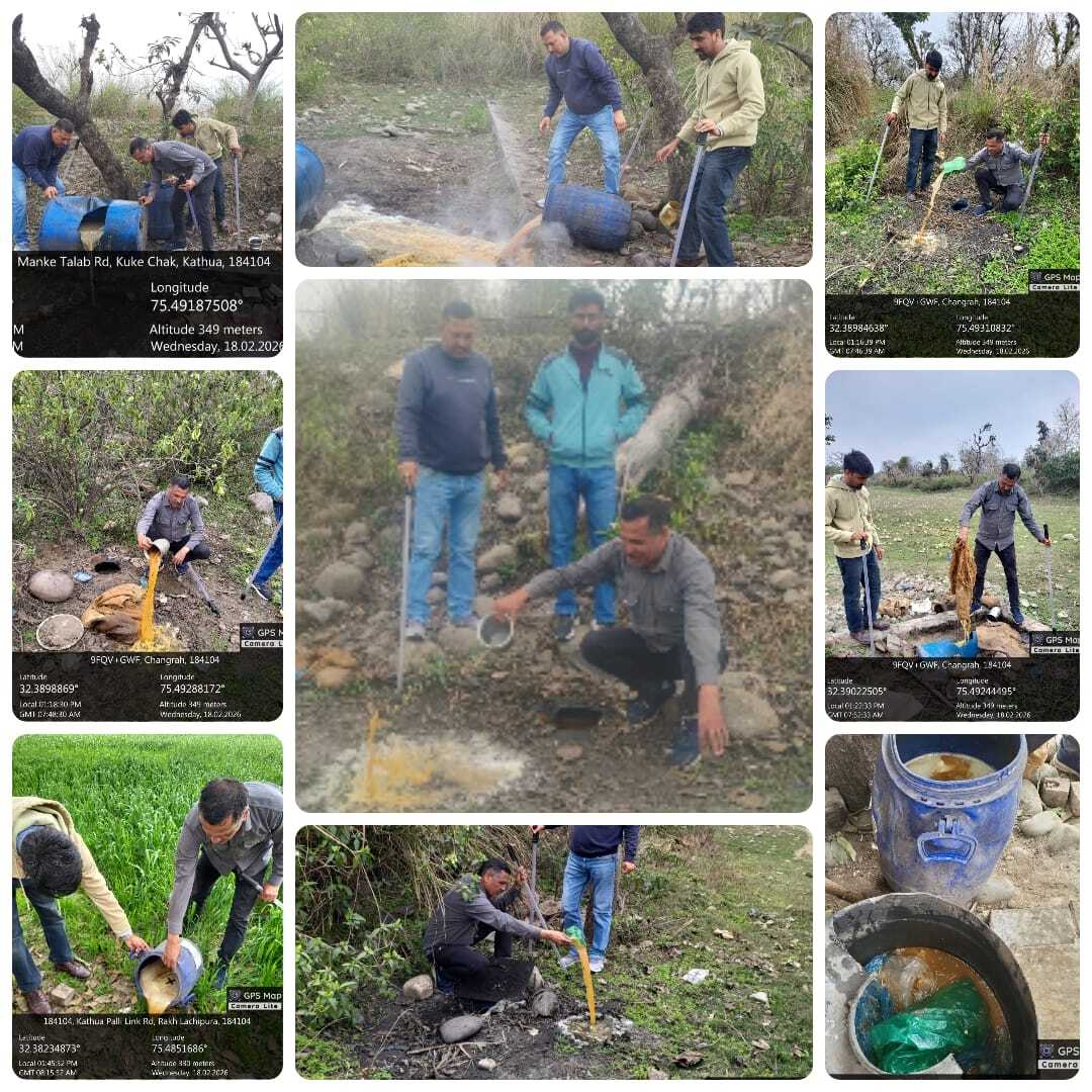 On 18-02-2026, on the direction of Worthy Excise Commissioner and DEC Executive, Jammu and under close supervision of ETO Kathua, ERK officials consisting Inspectors and other staff raided multiple hotspots i.e Badala, Kuke Chak, Chak Drab Khan. During the raid about 2300 Kg Lahan was found unattended ( in Drums, Cans and Pits) in stateland. Aforementioned Lahan was destroyed on spot.